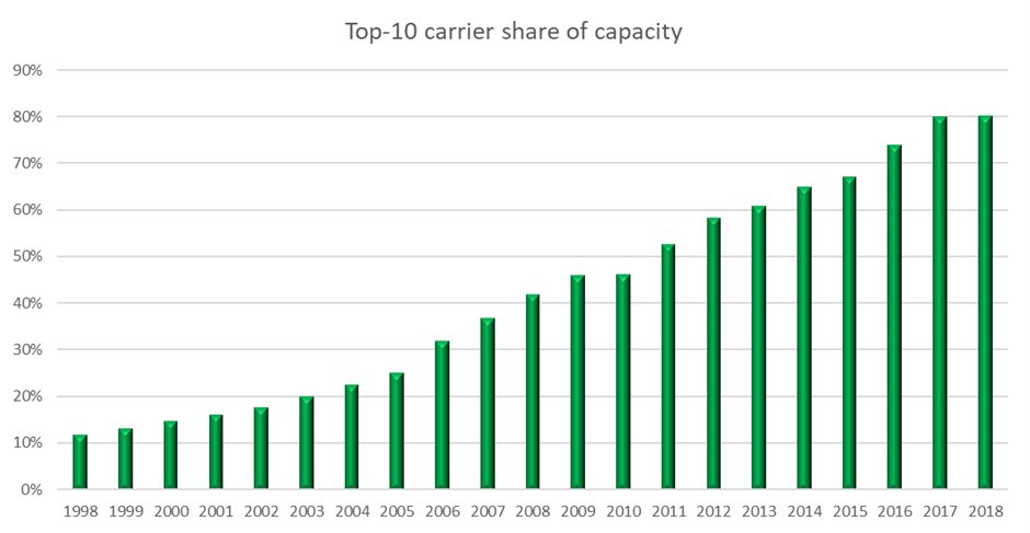 The past two decades have seen the top 10 carriers increase their share of total container capacity from 12% to a staggering 80% in 2018